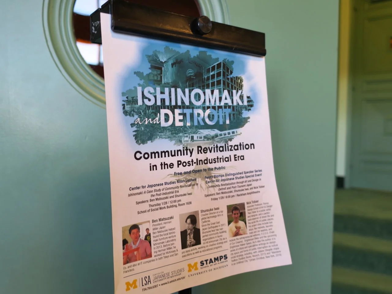 Matsuzaki-san and I delivered the second round of our lecture at the University of Michigan in the magnificent Rackham Amphitheatre on the campus. Once again we talked about Ishinomaki's community revitalization, and this time we were honored to join Associate Professor Nick Tobier at the Penny W. Stamps School of Art & Design, UM's art and design school. One of Professor Tobier's recent projects is the Brightmoor Maker Space which is transforming a building on the campus of the Detroit Community Schools, a K-12 charter school in Detroit, into a place for youth to build their creative making skills and incubate business ideas. Their concept of creating a craft studio for the community has a similarity to the idea of Ishinomaki Laboratory. The lecture, which took place as part of Penny Stamps Distinguished Speaker Series with support from University of Michigan Center for Japanese Studies, is available on YouTube along with our lecture at CJS.