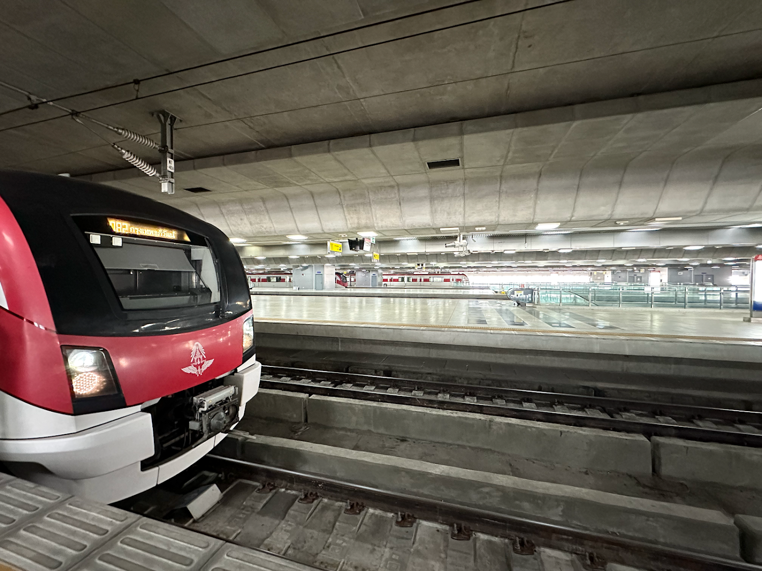 My first time riding the modern version of the State Railway of Thailand train. Dark Red Line, which opened in 2021, connects downtown and the northern suburbs of Bangkok as part of the Bangkok Mass Rapid Transit System, and uses the Hitachi-built SRT 1000-series EMU.