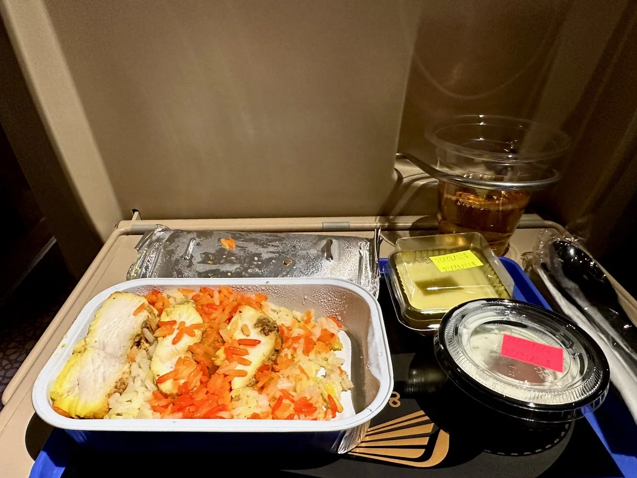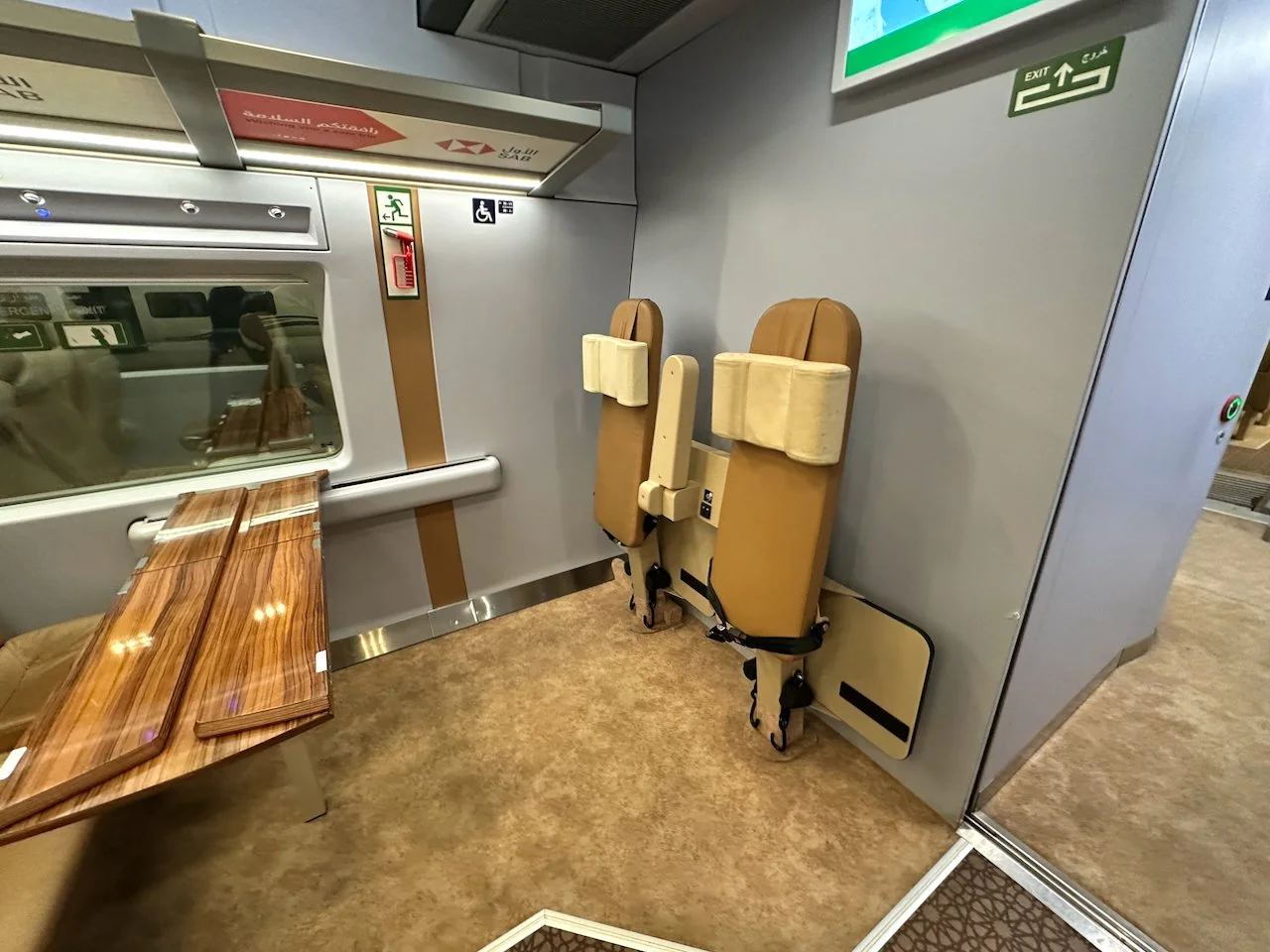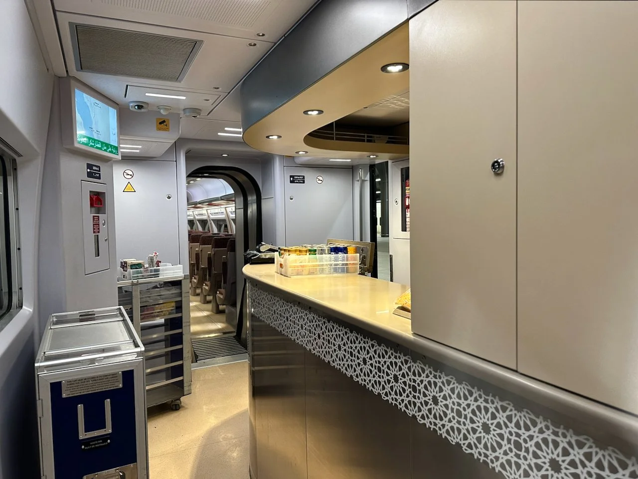 Once the train departed Medina, a date and a cup of Saudi coffee were served as a prayer was broadcast over the PA. Later dinner was served, and after that, the train kept running fast in pitch darkness.