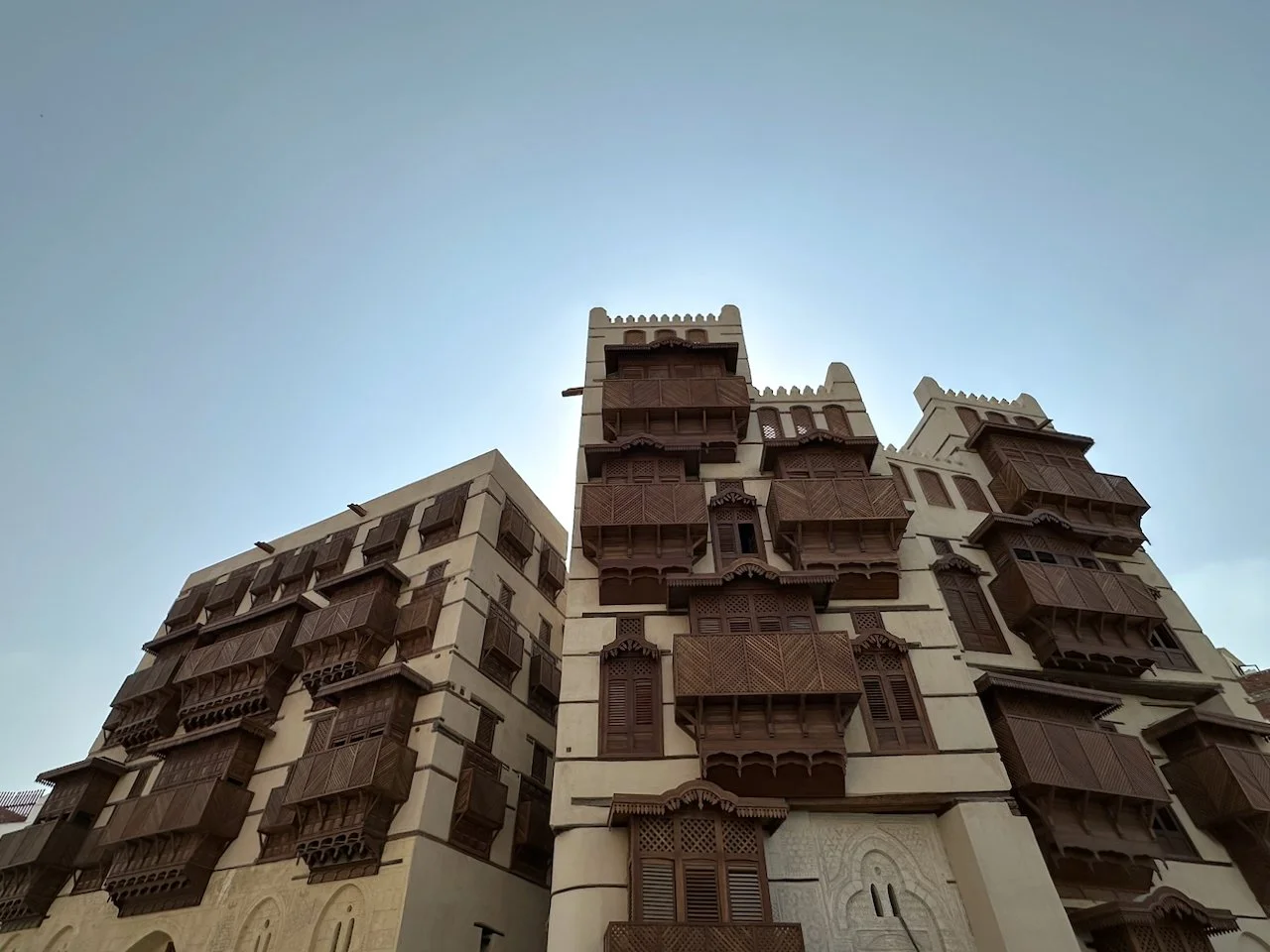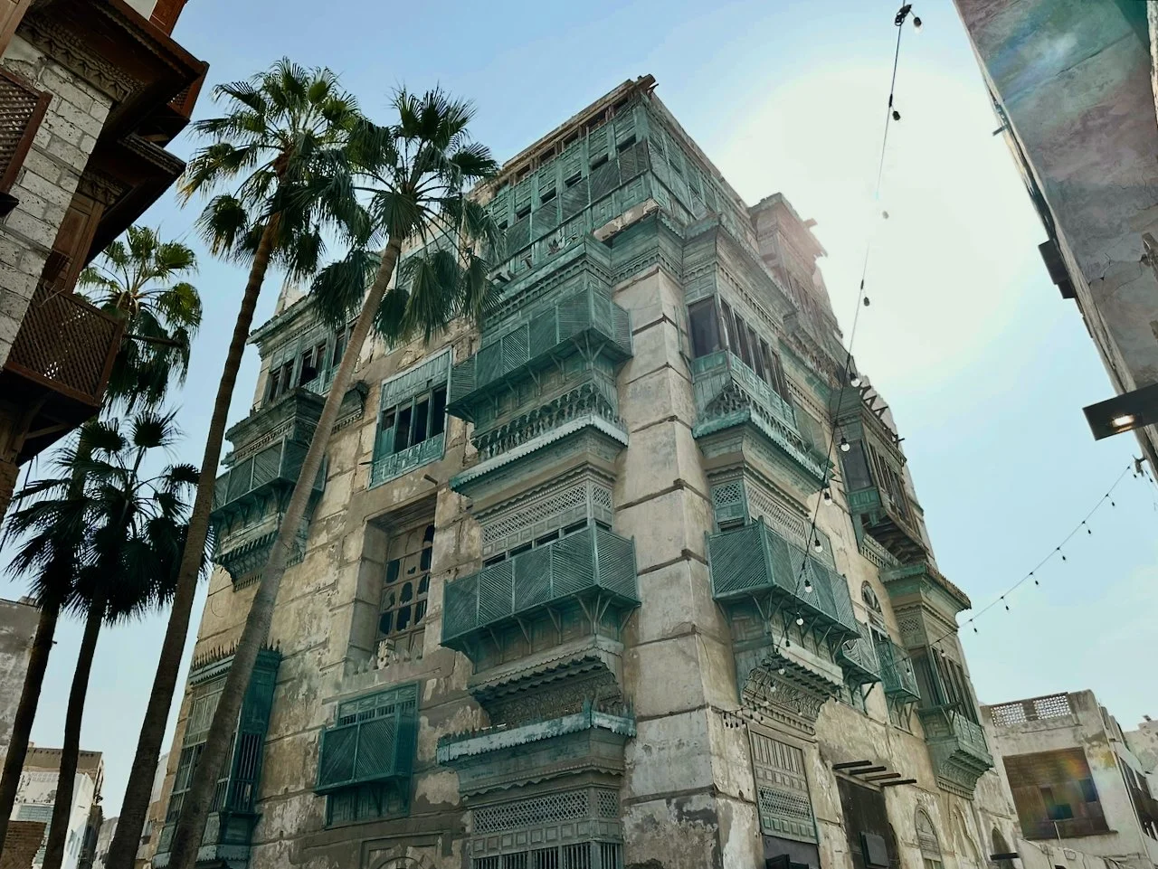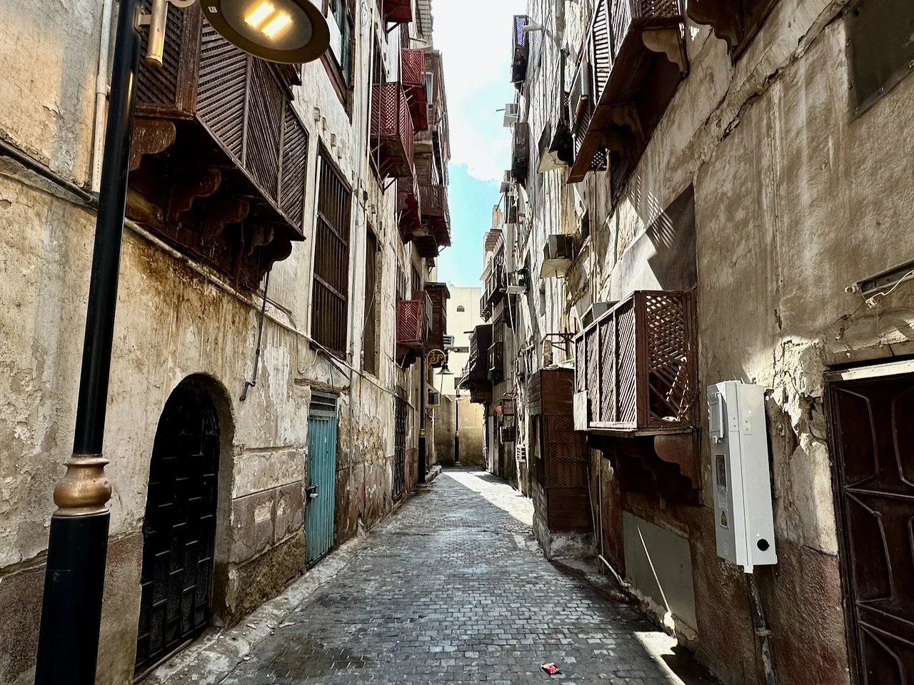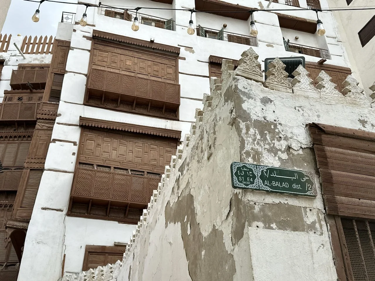 What I see is a forest of mashrabiya (oriel windows and balconies enclosed with carved wooden latticework). It is traditional wisdom for living in a city where the highest temperature rises above 40°C (105°F) in summer. I have just stepped into a breathtaking labyrinth of Hijazi houses wrapped in an overdose of mashrabiyas. Thank you, HRH MbS, for preserving this gem for the future. The Al-Balad district is a treasure of the world, not just for Saudi Arabia.