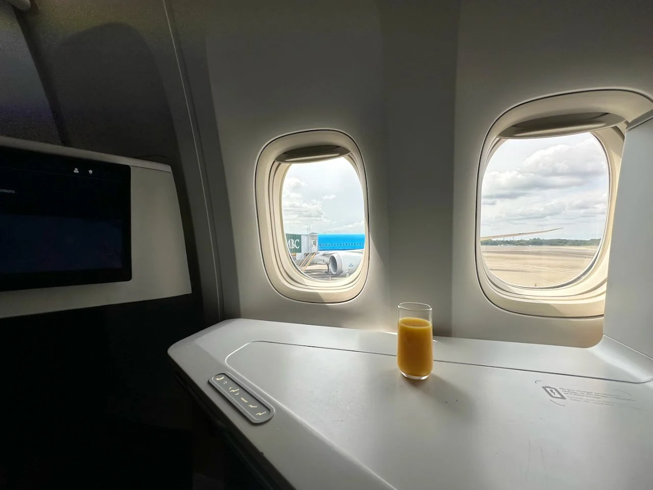 本日のCDG行きエアフラは、まるでUSへ飛ぶように東に向かって成田を発つ。ロシア空域が閉じられて以来、東京から欧州/英国方面へ向かうフライトはこの飛び方が日常的になっている。運がいいことに、前回と前々回のAF便に引き続いて、ほかのビジネスクラスシートよりもパーソナルスペースが広く、オットマンがはるかに大きなバルクヘッドシートのうちの一つを確保できた。
