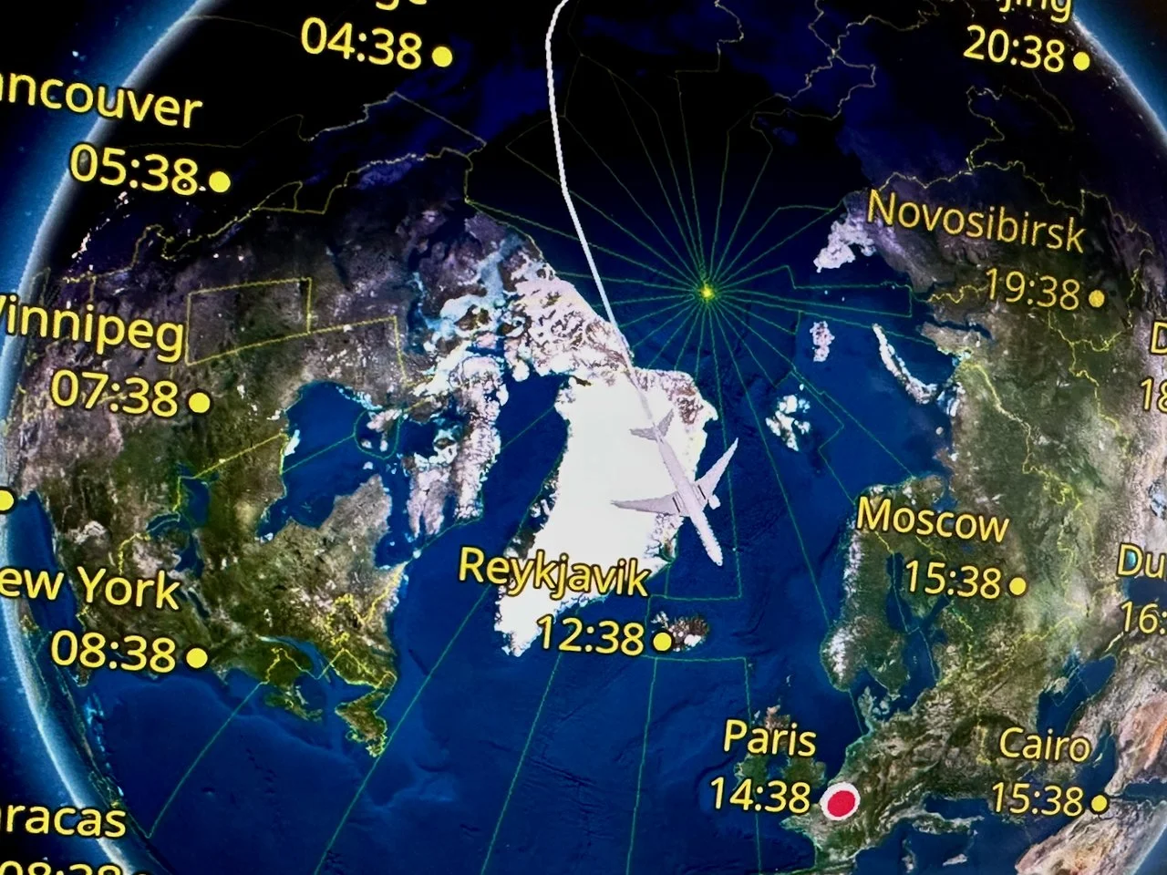 気づいたら、グリーンランド上空、北極の近所を飛んでいた。
