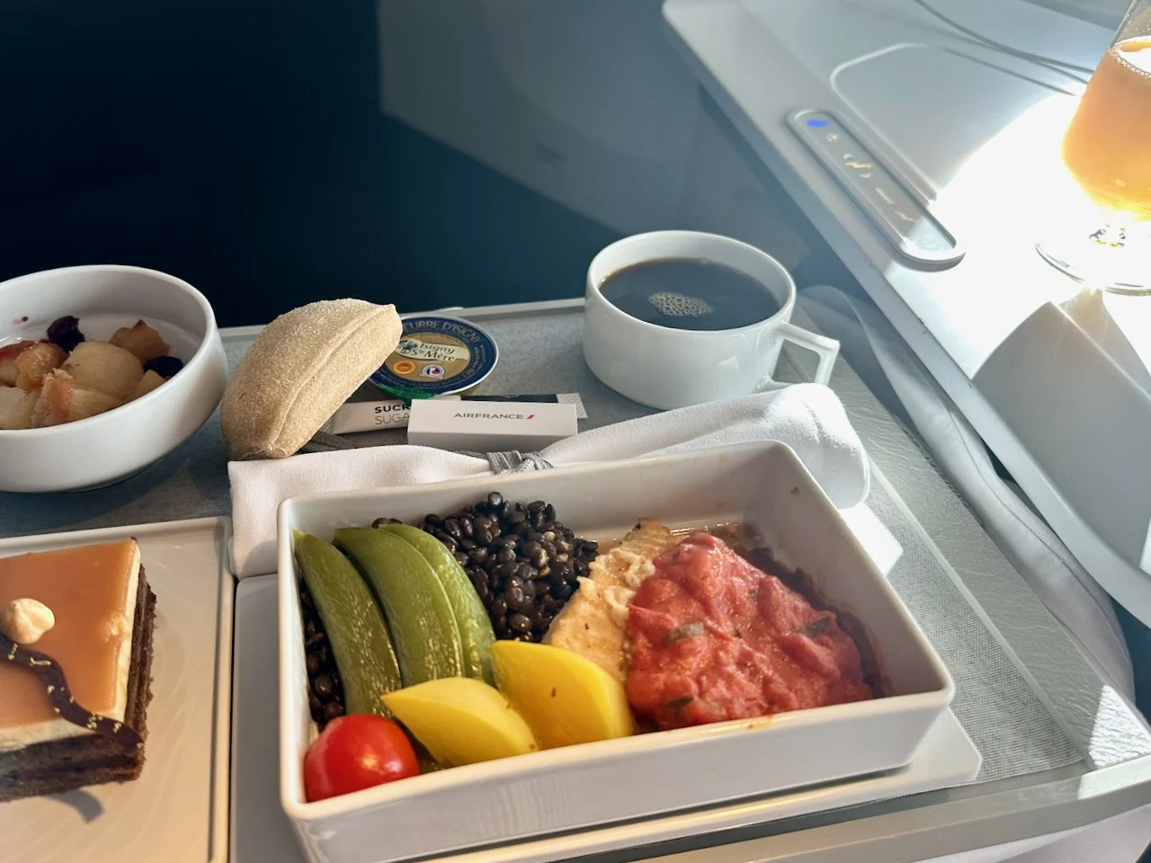 The second meal is, coincidentally, seared Greenland halibut with a creamy tarragon and tomato sauce, served with braised lentils, split peas, and turnip with saffron. The Air France catering never disappoints. It feels like breakfast, but it’s actually a very late lunch—or a very early dinner—given the local time at the arrival city.