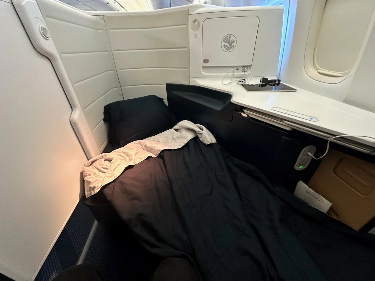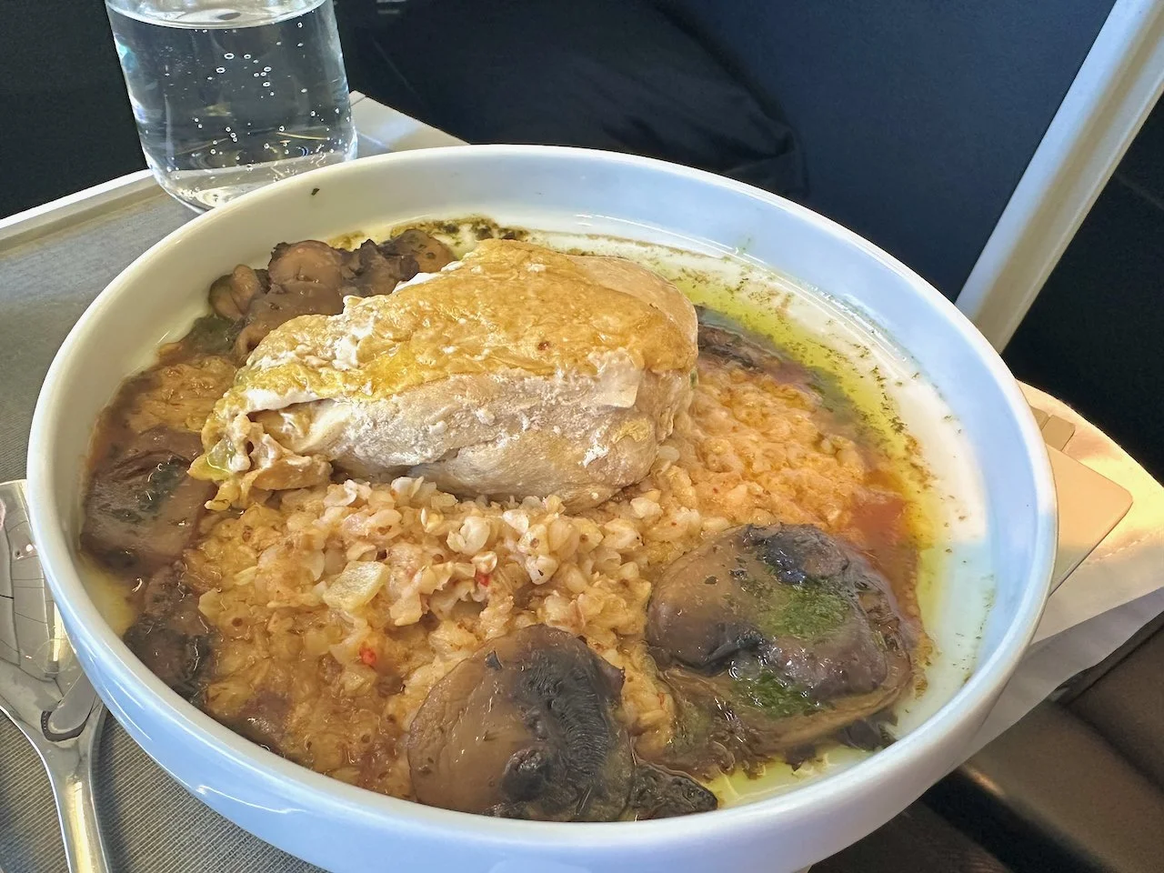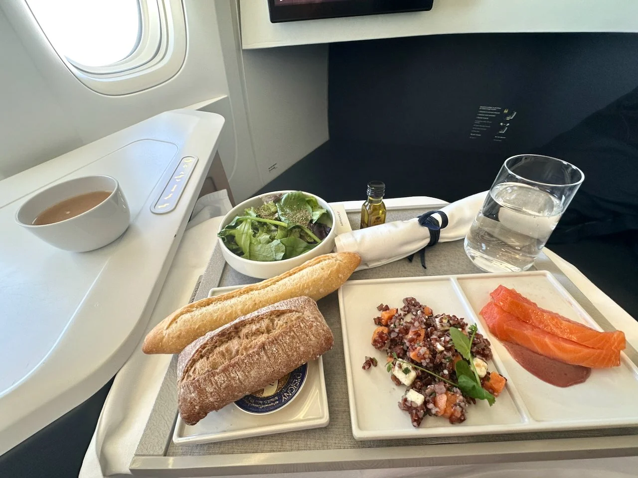 Following Air France tradition, the first meal was served with a baguette and a bowl of miso soup.