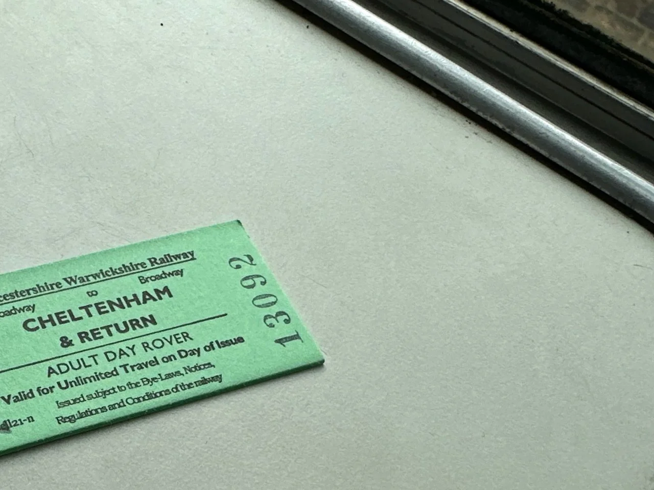 While driving near the village of Broadway, I came across a small station for a heritage railway. So I parked the car, walked up to the station, checked the timetable, and saw that the next train was about to depart. I couldn’t resist and hastily bought a round-trip ticket. The station staff said, “Go to Mary and get on. It’s first class and nicer.” The carriage was a classic British Rail Mark 1, and to my delight, the ticket was printed on thick cardboard. All aboard—even though I have no idea where it’s going.