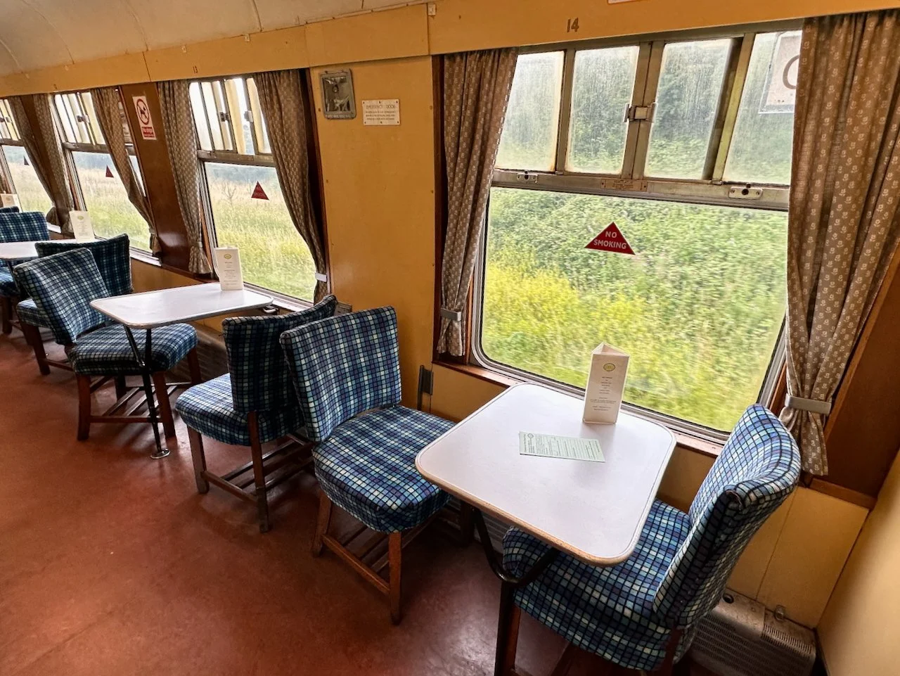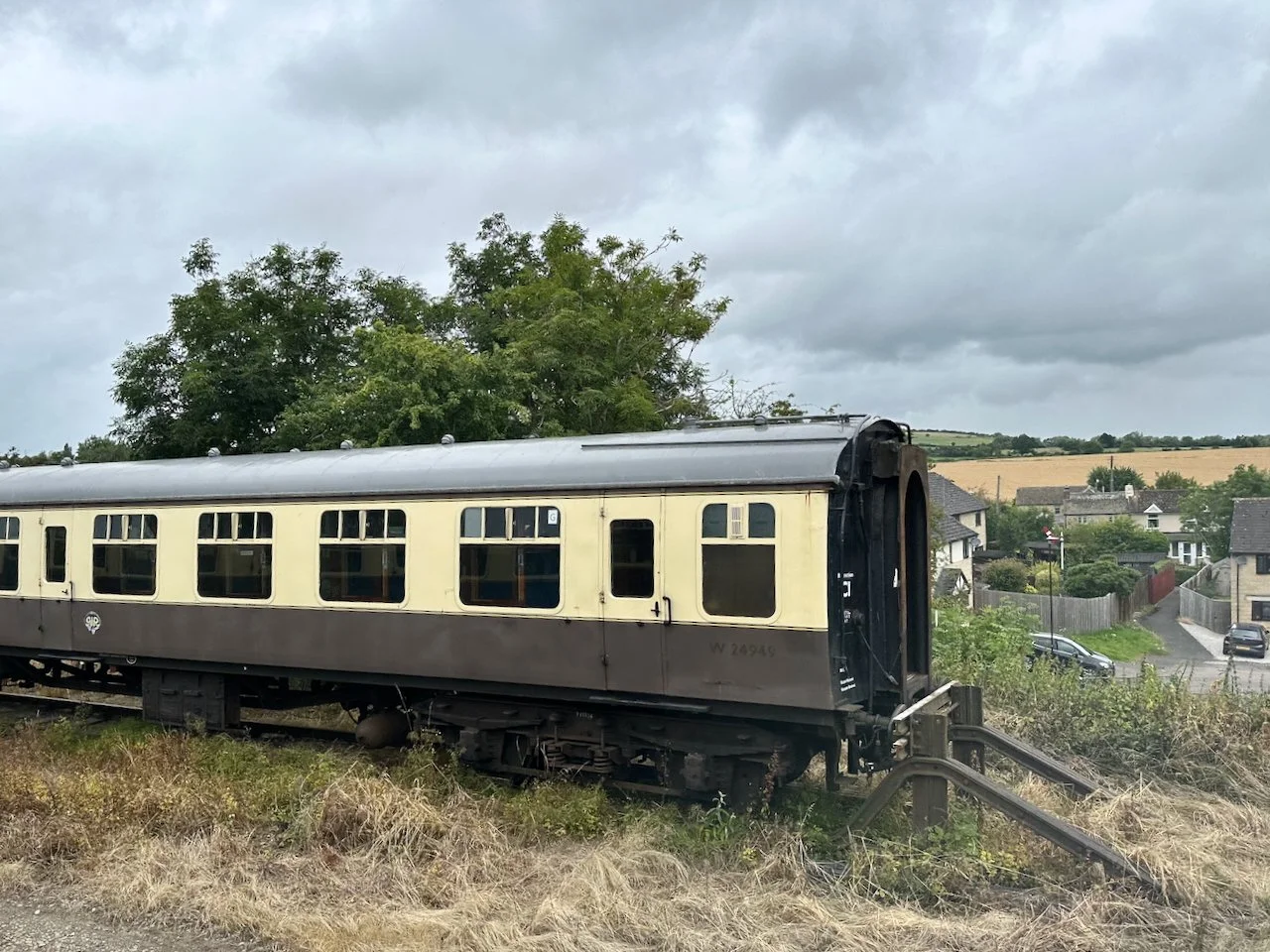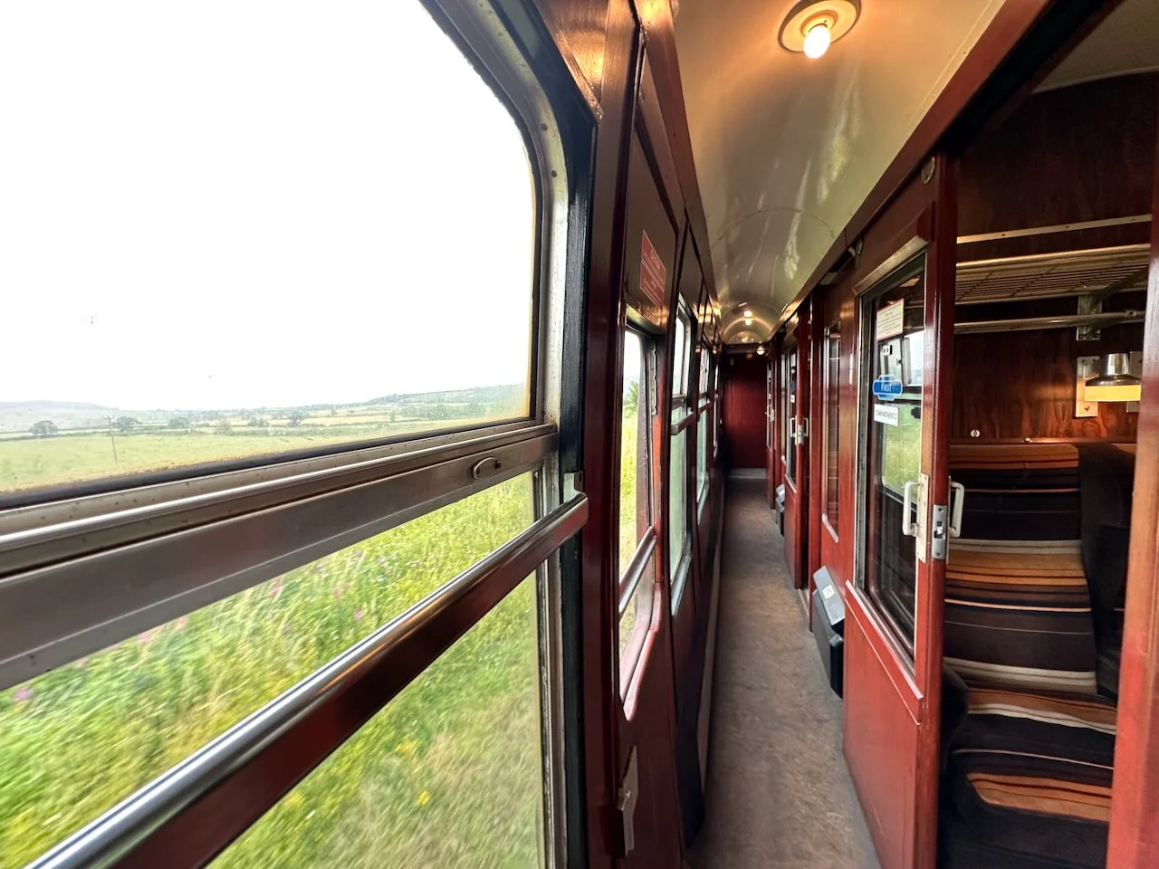 The Gloucestershire Warwickshire Steam Railway is run mainly by volunteers, using the former Great Western Raliway (the old GWR, not the current GWR) route that connects Broadway with the outskirts of Cheltenham. As the name suggests, trains are operated with a steam locomotive, but since I just jumped on this train, I haven’t yet checked what type of loco is pulling our carriages. I can only hear its sound.
