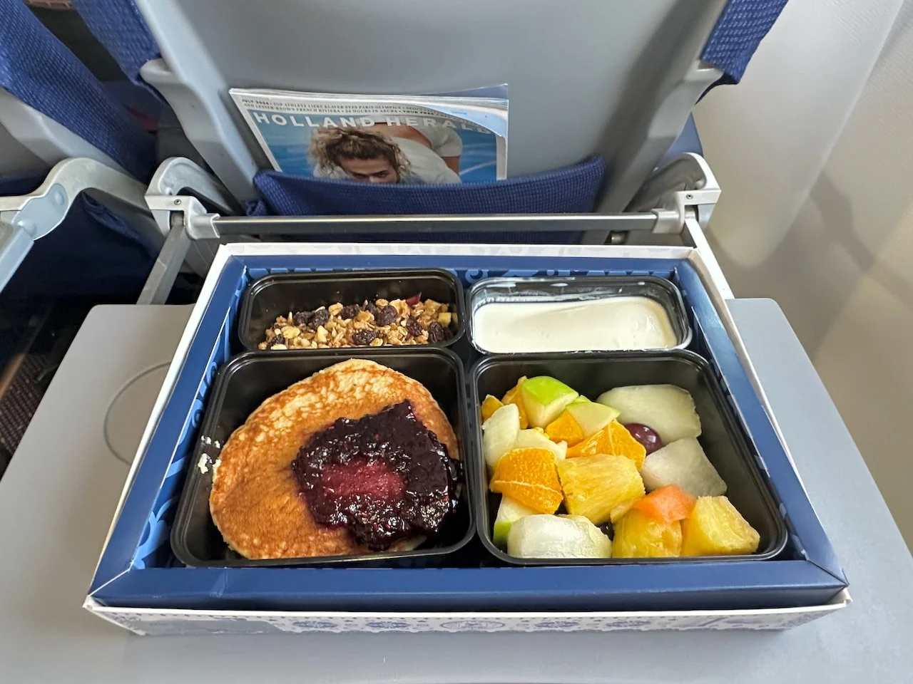 朝食は、この前乗ったAMS-LHRのフライトでサーブされたベントーボックスとまったく同じ中身だった。KLM B737-800 AMS-CDG。生涯834フライト目。