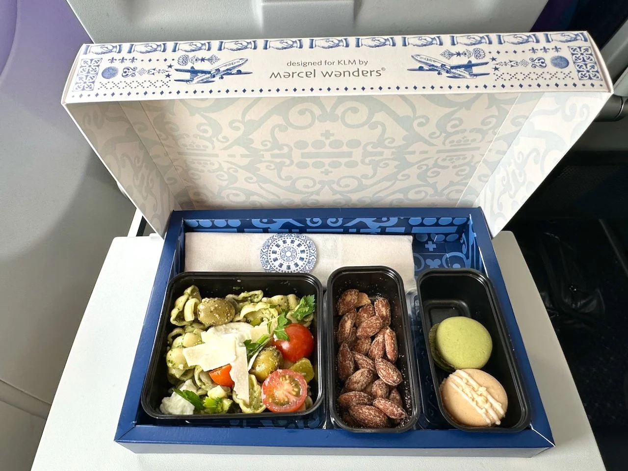 おなじみのKLM弁当ボックス。短距離便の場合、CAさんは手渡しやすく、乗客も食べ終わったあとに片づけてもらいやすい。KLM B737-800 MAN-AMS。生涯833フライト目。