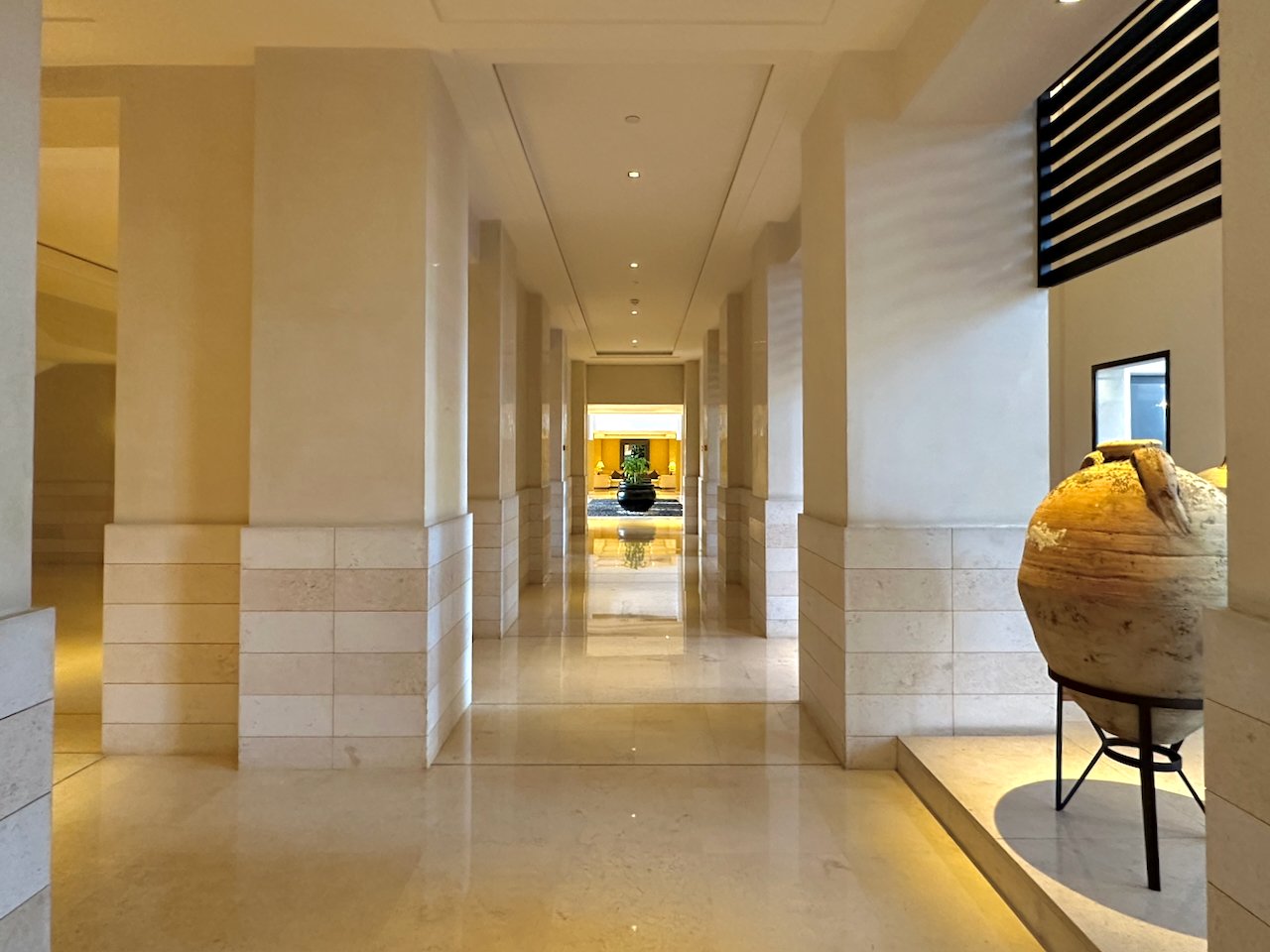 ホテルの一階の空間は海に向かう軸と、海と平行に走る軸で構成されている。光に満ちていて開放感があり、ちょっとだけパークハイアットザンジバルのロビーエリアを思い出させる。