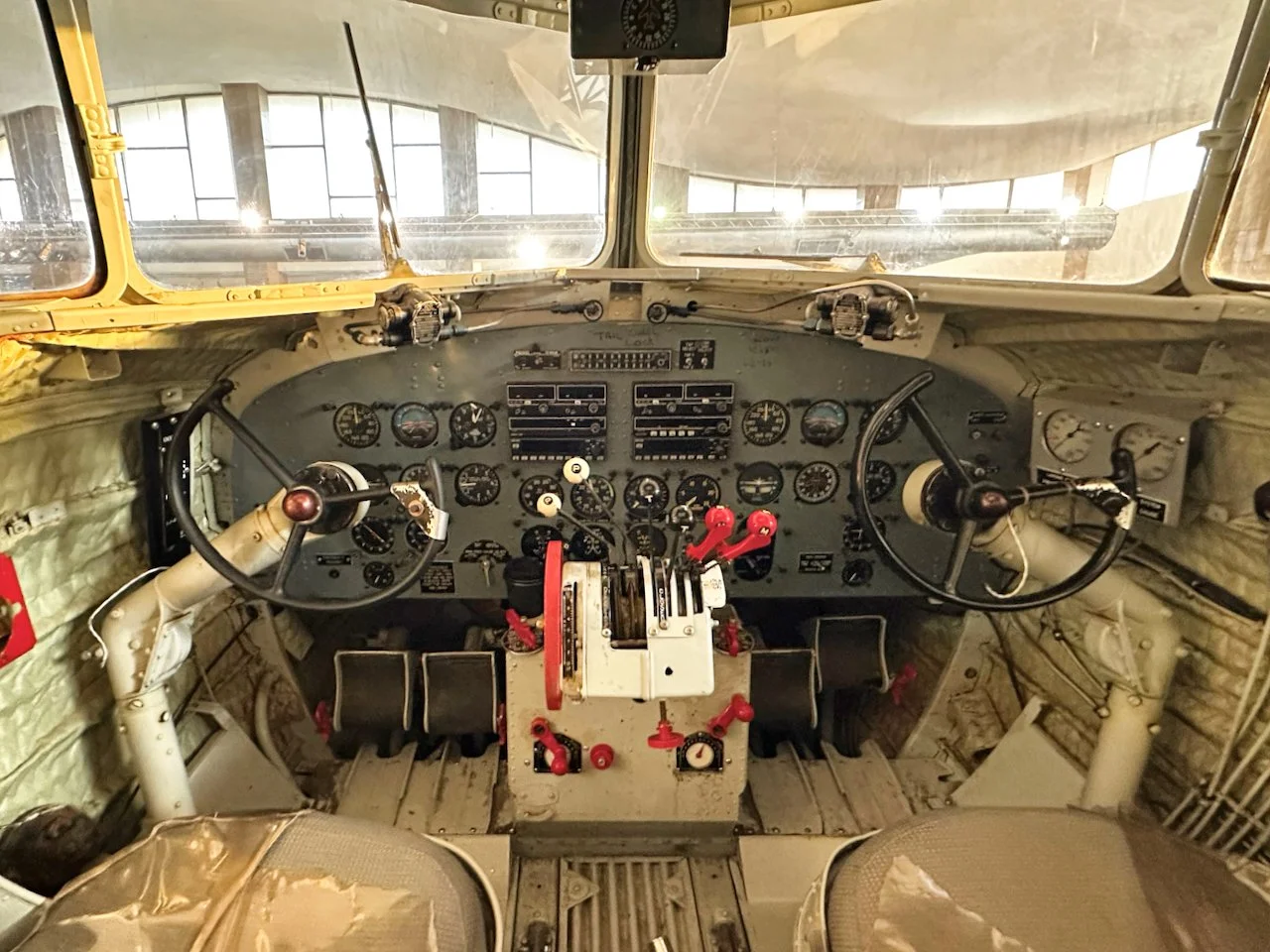 ミュージアムの建物の中に入っていたら、また別のお宝がいた。こちらは707ジェットの前任者にあたる、ロイヤルフライトで使われたDC-3。機内にある製造プレートによると、HZ-SAR1というレジを持つこのヴィンテージはもともと軍用のC-47B スカイトレイン a.k.a. ダコタだったが、戦後に民間用のDC-3Cに改修されて王立サウジ空軍に納入された。C-47Bというバリエーションだけでも3,300機以上、つまりすべてのボーイング747を合わせた数の倍以上作られたと知ると、ただ驚いてしまう。