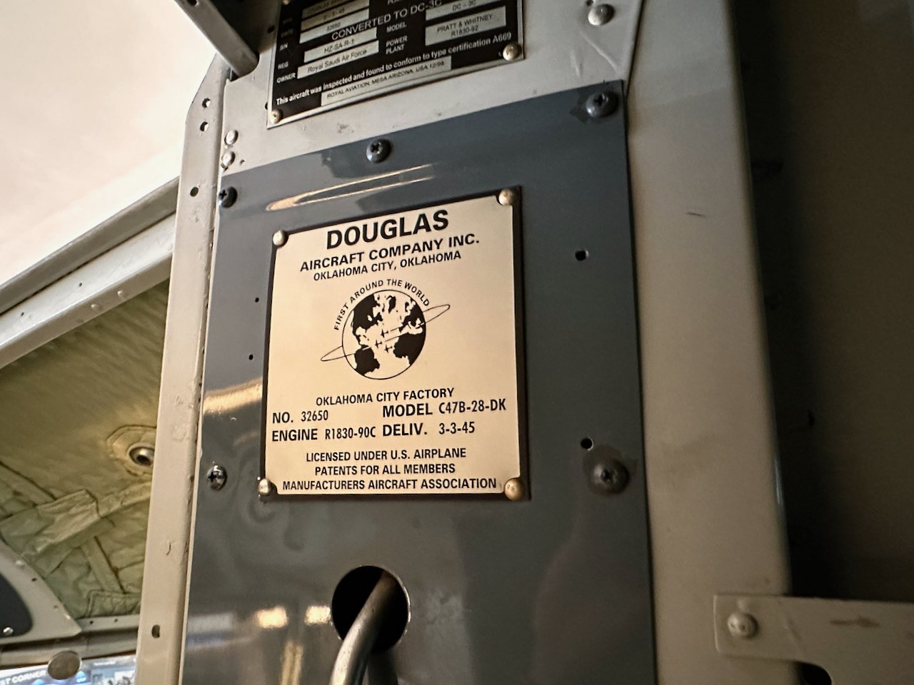 I walked inside the museum’s display hall and found another gem—the DC-3 used for the Saudi Royal Flight, a predecessor to their 707 jet. According to the builder’s plate onboard, this vintage bird, HZ-SAR1, was originally a military C-47B Skytrain, a.k.a. the Dakota, before being converted into the post-war civilian DC-3C and delivered to the Royal Saudi Air Force. It is always surprising to learn that more than 3,300 aircraft were built as the C-47B variant alone—twice as many as all Boeing 747s combined.