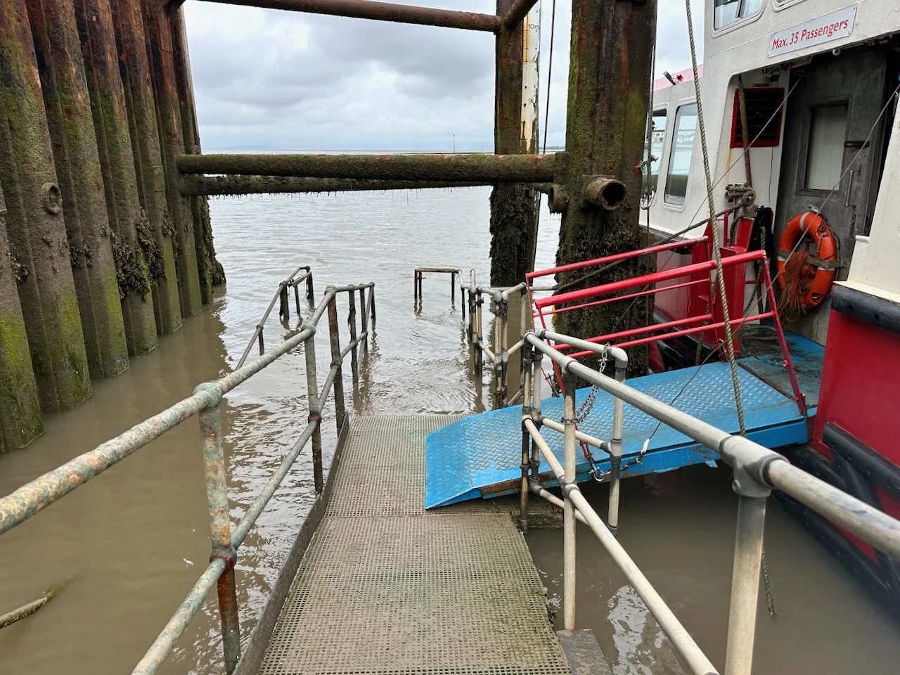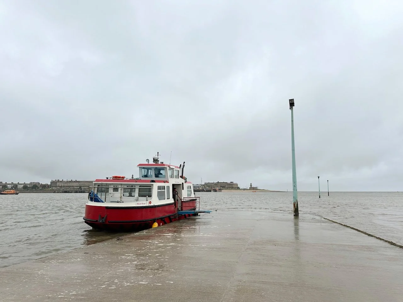 ワイヤ川の河口にあるフリートウッドと、ノット・エンド・オン・シーという対岸の村を結んでいるのは橋ではなく渡し船だった。河口周辺の砂堆のせいか、川の水は泥のような色をしている。ワイヤローズと名づけられた船による片道5分の旅に出てみたら、その色が空とアイリッシュ海の色に溶けていく様子を眺めることができた。